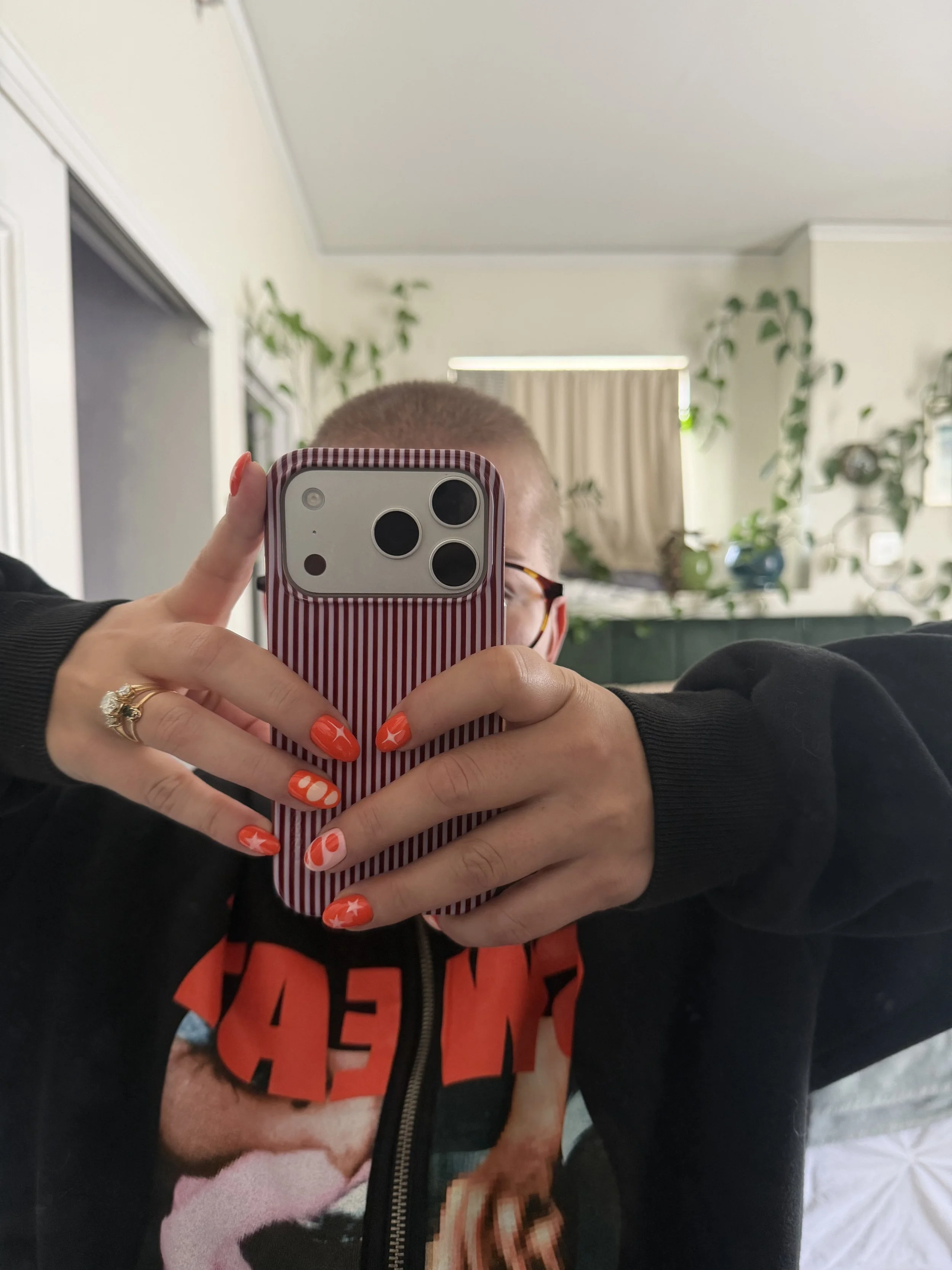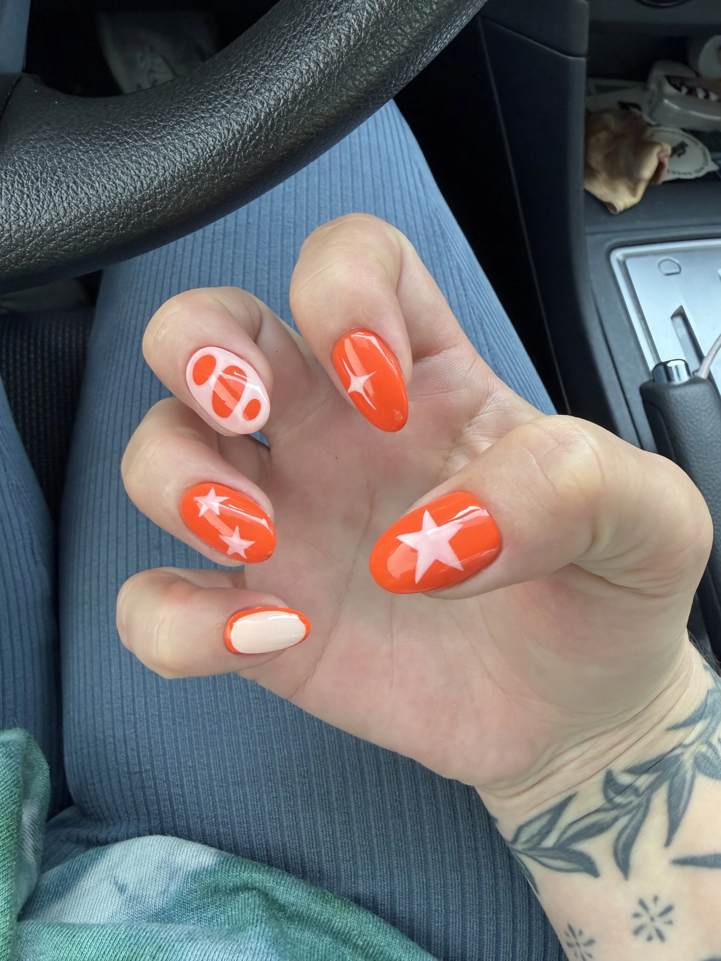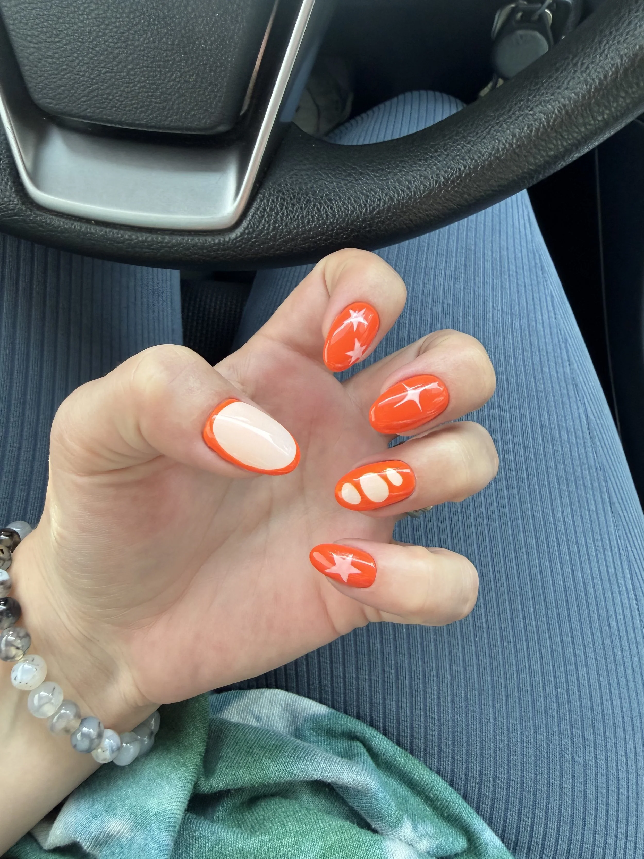Nails!!!! I’ve had these light blue with olive green stripes nails for a month and it’s time for new new!!! I wanted something springy but not pastel, warmer tones because I like to go back and forth. It literally took me until I was getting my stripes filed off to decide on the design and the colors, but it paid off. I ended up with the cutest orange, dreamsicle, 50s kitchen nails and I love them so much. I saw Oda at Nails House by Bonati for these. When I tell you that getting my nails makes my day….I was having a tough one right before. All it took was a couple hours getting my nails done and I was happy as a clam. And I really can’t stop staring at these orange beauties. Also, I was so honored to be the Bonati Monthly Girl, where Nails House by Bonati features someone who goes there. Check out the post here <3
