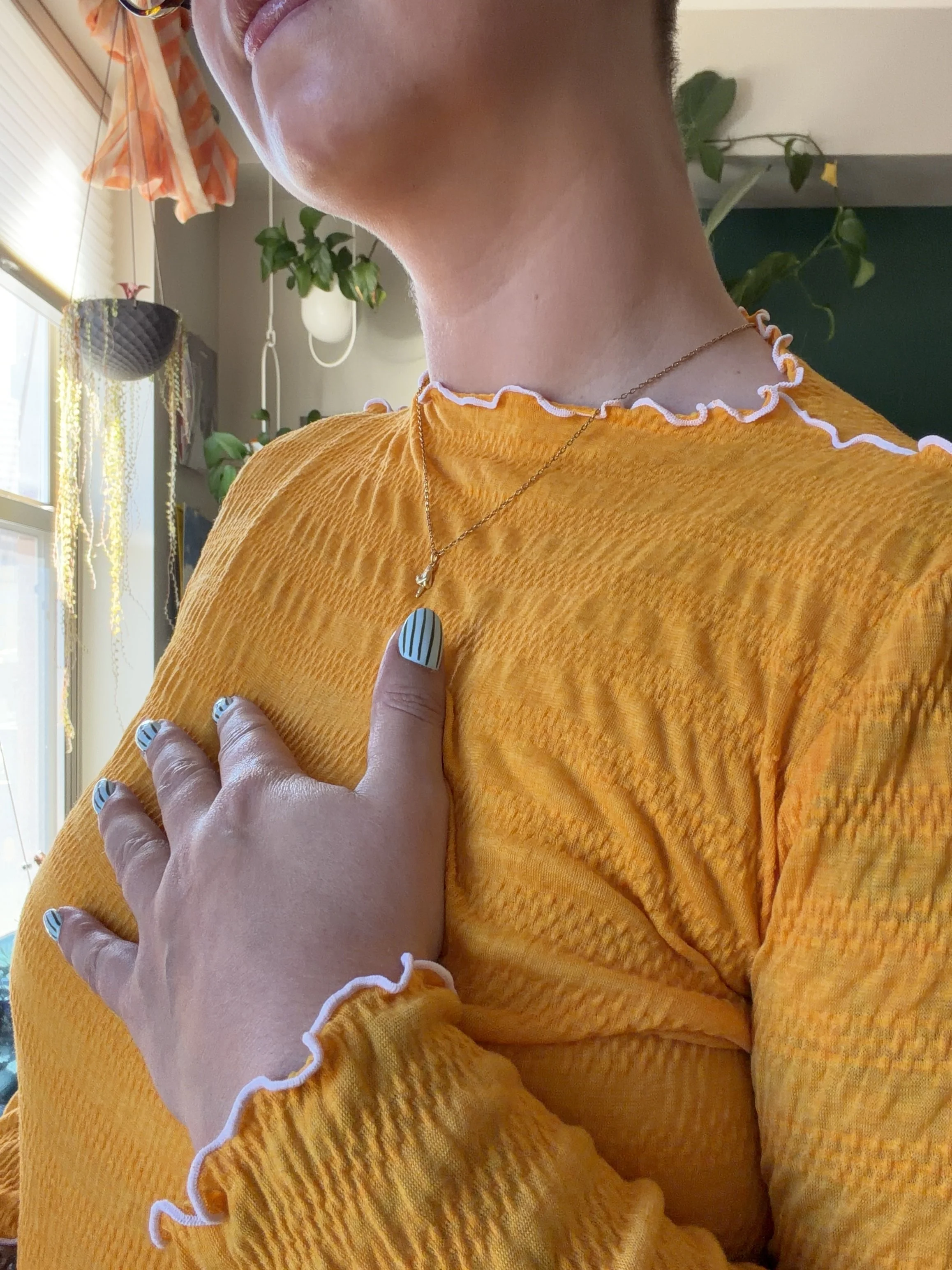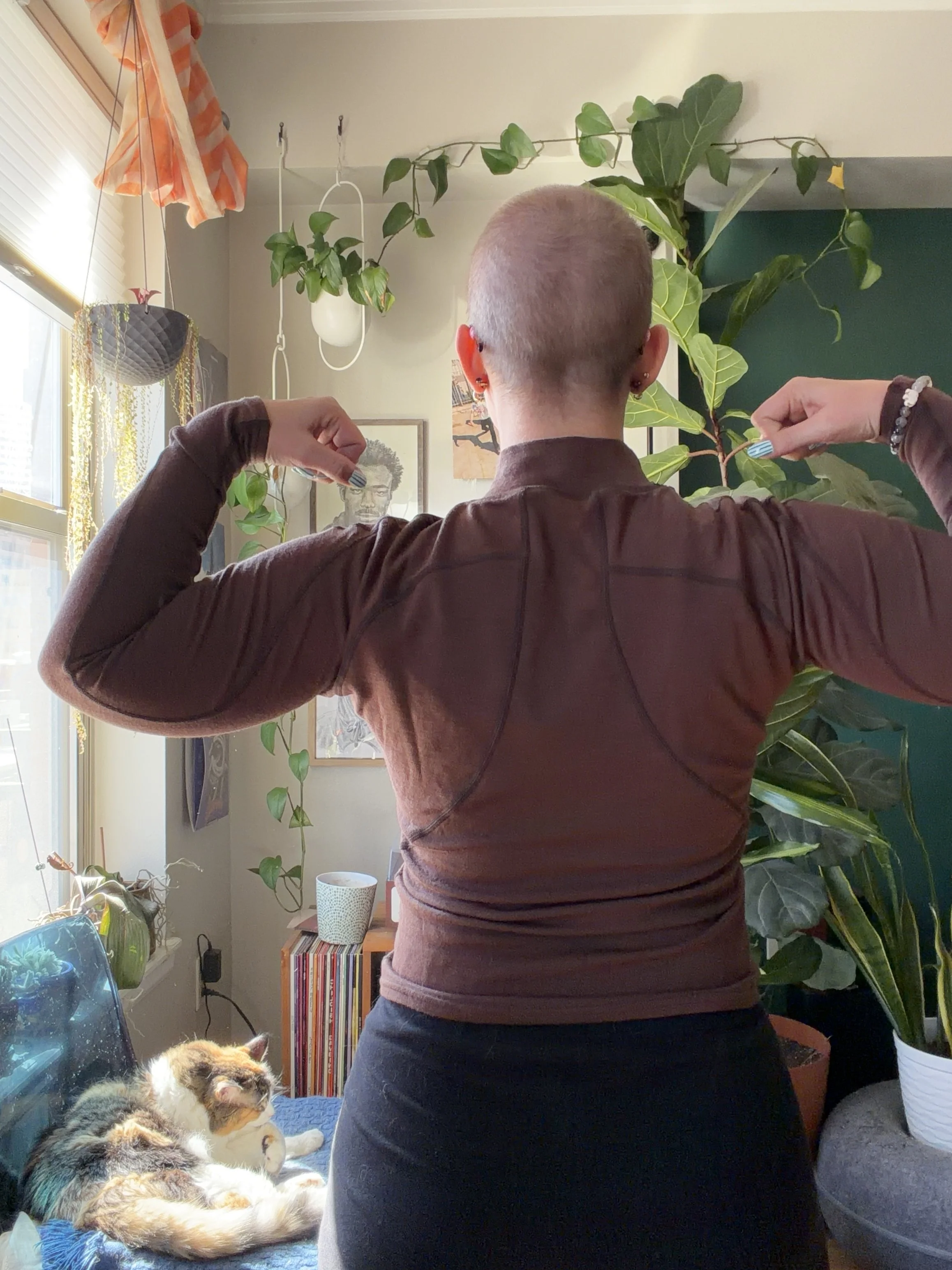 My review: Oh it’s rare I leave the house without one of these in the spring, summer, and fall. We go on a walk? I throw it around my waste. We head out for a hike? I’m wearing it over my Kara Bra before I warm up. It has a slight mockneck too which is so cozy. I love this material, stretchy yet really sophisticated. The lettuce hem, I love. The colors! Like a lot of Halfdays things, this incorporates into your wardrobe for casual and even into dinner and around town type settings, outside of it’s obvious use of for the outdoors. Perfect weight, perfect stitching and hemming, the mockneck is everything, 10/10, will need another.