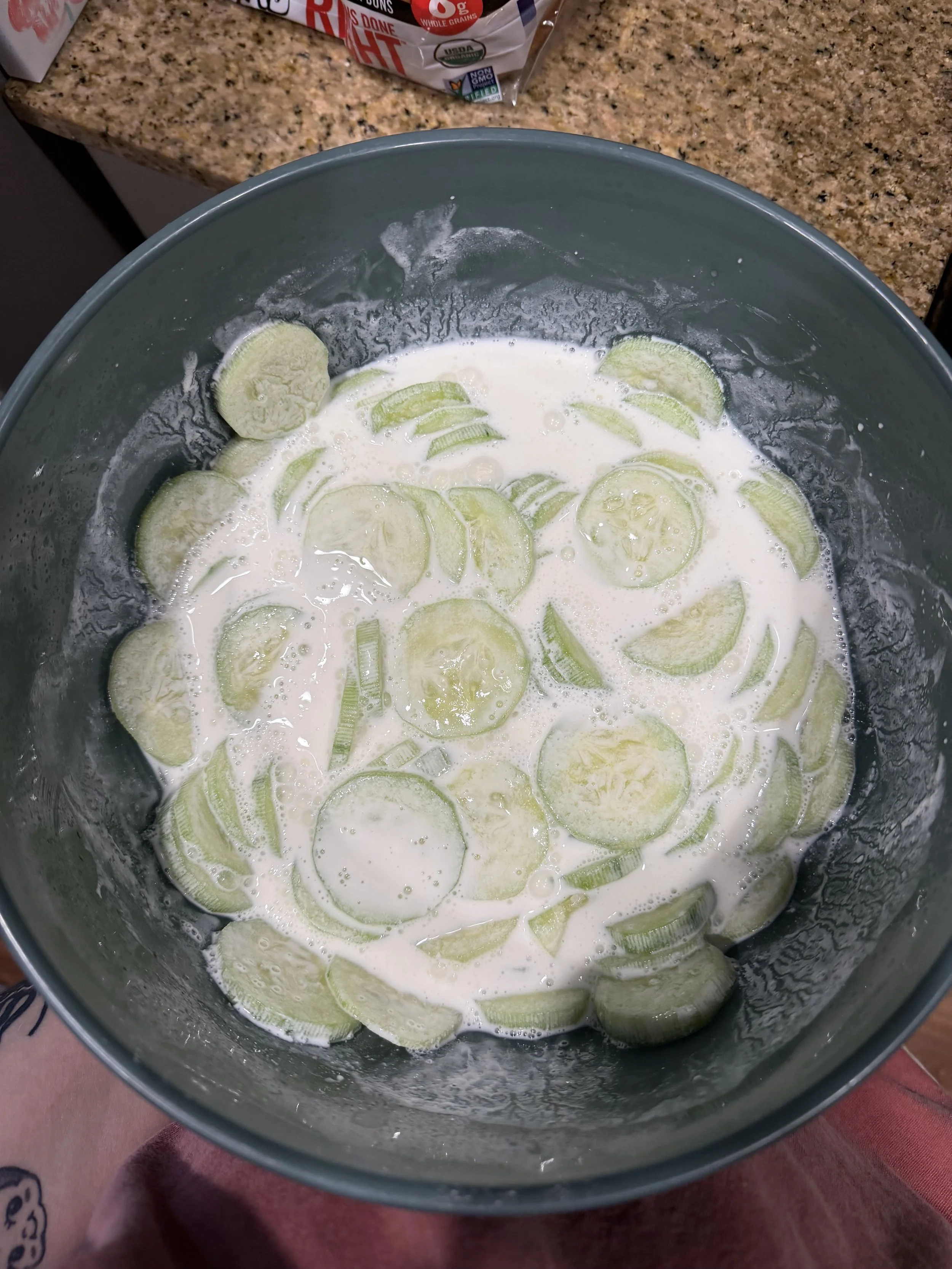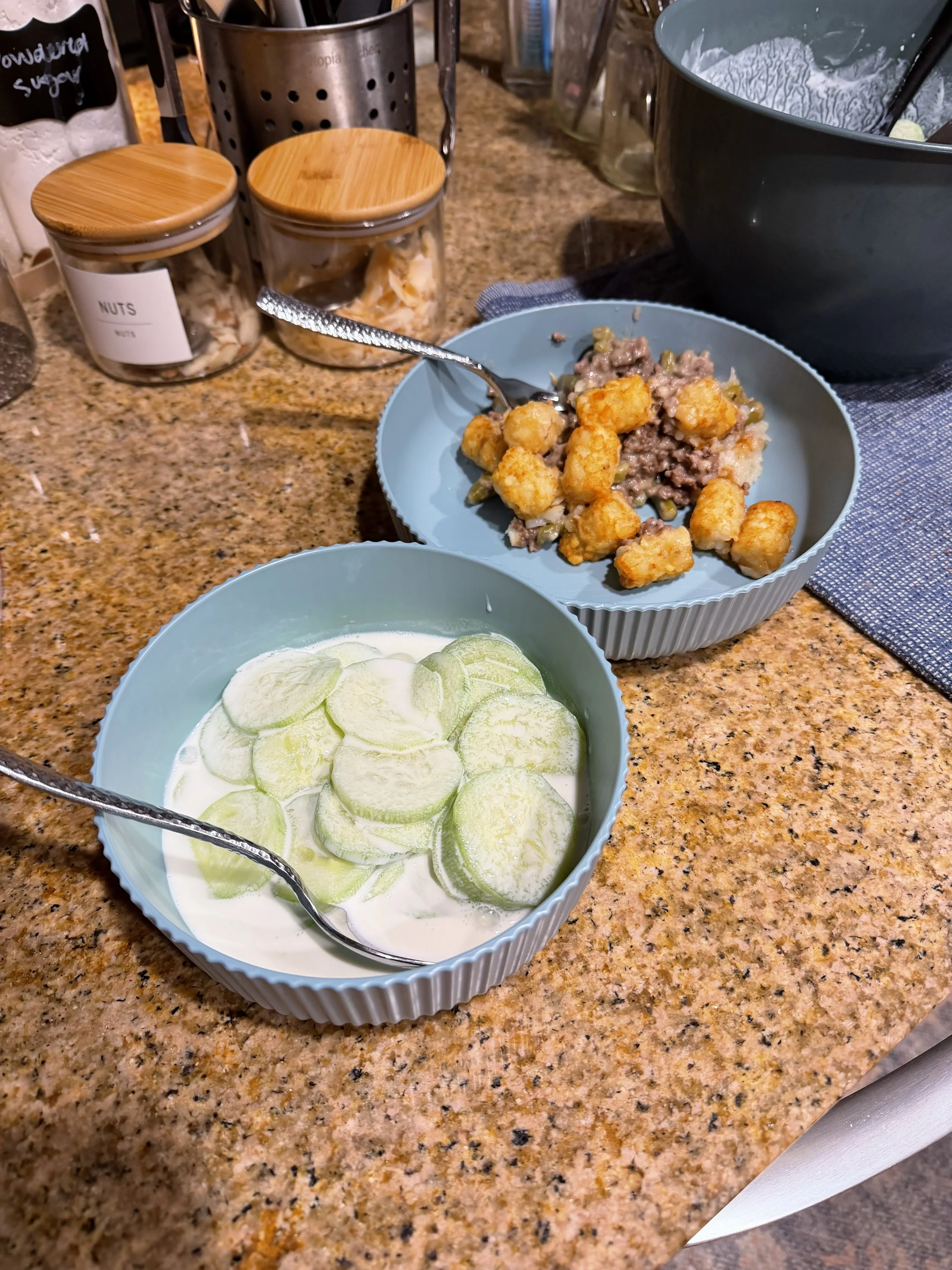 Tuesday night I was craving food I grew up on, and wanted hotdish soooo bad. My mom bought and mailed me a copy of the First Lutheran cookbook (our church cookbook with all the good recipes in it) and I’m waiting on it, but I know tater tot hotdish by heart. I do ground beef, cream of mushroom, and green beans, then topped with tater tots obvi. On the side a true classic ND dish, cucumber salad. I do cucumbers, salt, into the fridge, then take ‘em out and add half and half and vinegar (maybe a 2:1 ish mix) and more salt. Back in the fridge and then they’re ready (best the next day, but so is the hotdish!). This was the best set of leftovers…….. – received the cookbook, thinking of a “Midwest Meal Prep” series I could do…It would be so good…stay tuned watch this space queen.