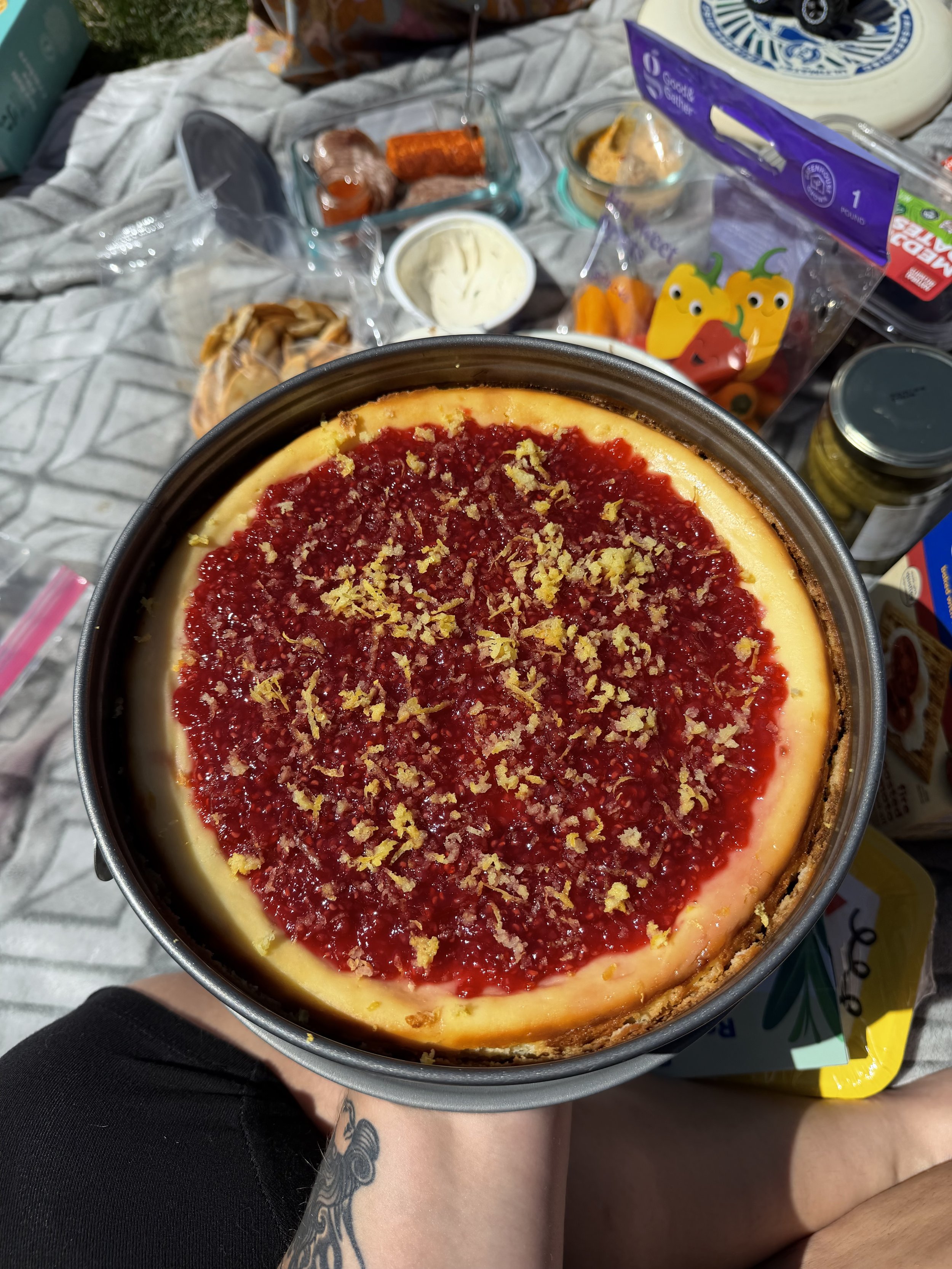 We had a picnic at the park with our friends! We got to see Ashley and Ara and Claire and Abbie and Alex and Winnie and Becca and Jake and Oliver! It was fab. I made a raspberry lemon cheesecake the night prior to bring, we grabbed some snacks at the store, and we brought it all out to Cheesman for a picnic. Blankets and chairs and babies and snacks and sun and yapping and it was a perfect day. Truly fabulous. We ended up being there for almost 5 hours. So tell me why it’s not Monday morning and I’m sore? Why is my neck sore. Why is my back sore. Oh because I sat on the ground for so many hours. Ok.